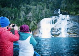 Desembarcaremos para visitar la Cascada de los Cántaros. Allí ascenderemos por una escalinata de unos 600 escalones de madera, bordeando el río Los Cántaros, desde donde se pueden admirar saltos y cascadas de notable belleza. Luego se desciende nuevamente al muelle para embarcar y cruzar el brazo para llegar a Puerto Blest. (Según la época del año y las condiciones climáticas, una alternativa para aquellos que gustan de caminar por la naturaleza, es conectar la Cascada los Cantaros con Puerto Blest, realizando una caminata de unos 3 km atravesando la Selva Valdiviana, en lugar